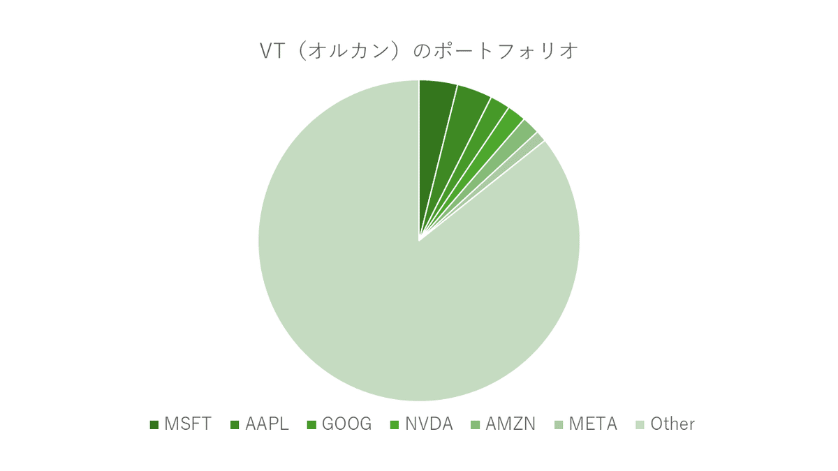 まずオルカンですがマイクロソフトが3.86%、アップルが3.55%、アルファベットが2.02%、エヌビディアが1.91%、アマゾンが1.82%、メタが1.13%となっており、その他は85.71%です。