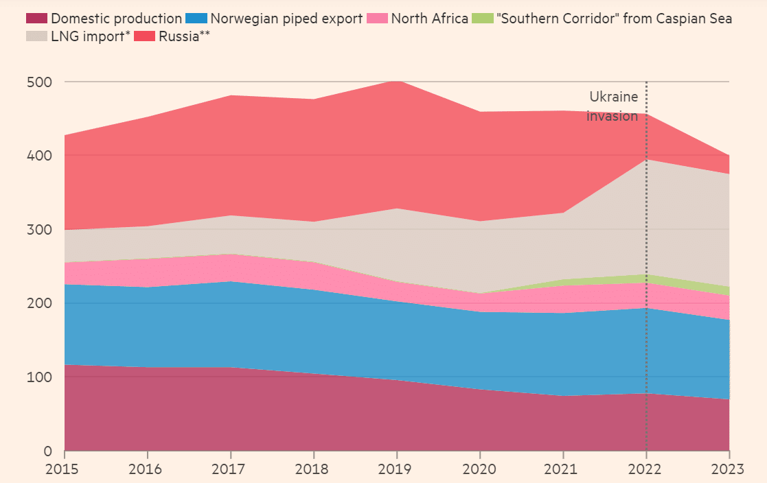 下のチャートはEUがどこから天然ガスを買っているか? を示しています。
