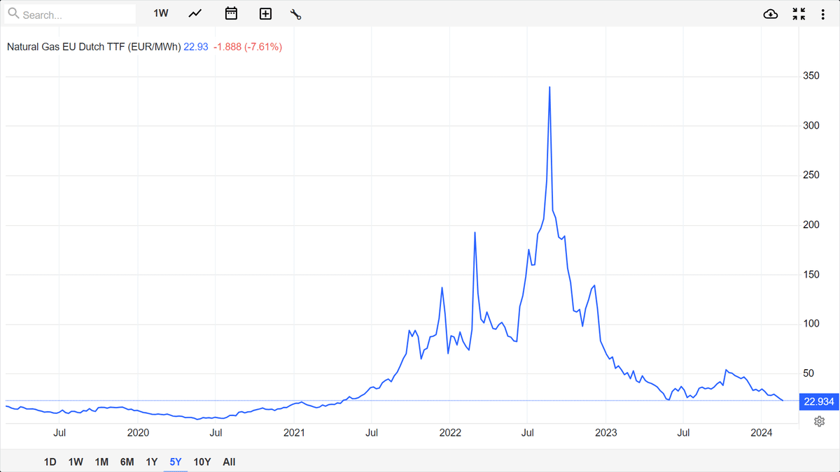 加えて最近はLNGによる供給過剰から欧州の天然ガスの指標銘柄であるTTFの価格は安値圏を這っています。