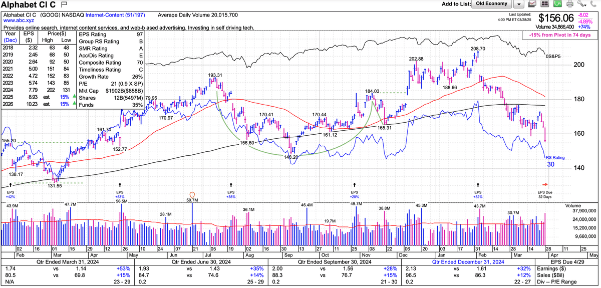アルファベットの場合、3月18日に付けたザラバ安値158.80を既に破り金曜日は156.06で引けました。つまり「底抜け」になってしまっています。次の下値メドは去年の9月9日に付けた148.20になります。