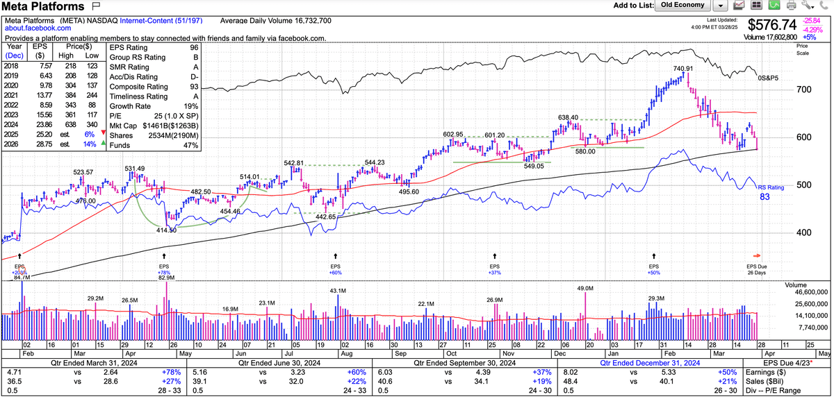 メタの場合3月19日に付けたザラバ安値 574.77に対し金曜日の引け値は576.74と肉薄しています。