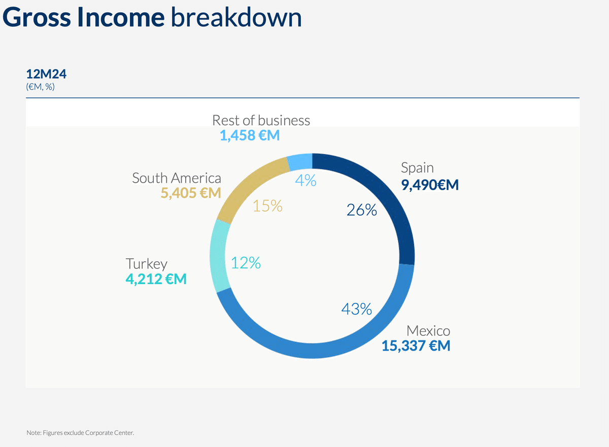 スペインが発祥の地ですが、中南米でのオペレーションのほうが母国より大きく、**「メキシコを中心としてスペイン語圏に展開する銀行」**と理解するのが最も適切だと思います。ちなみにBBVAの利益の43%はメキシコからもたらされています。