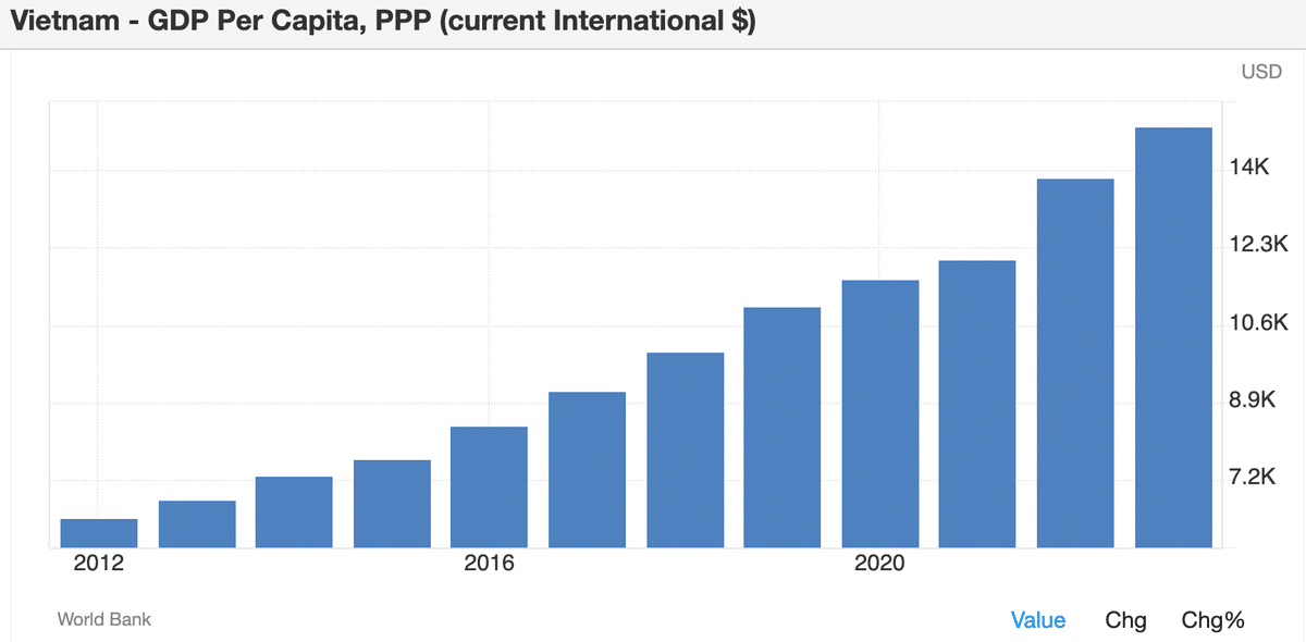 ベトナムの購買力平価修正後一人当たりGDPは14,000ドルを超えており、こちらも労働力のやすさを売り物に競争することが次第に難しくなっています。