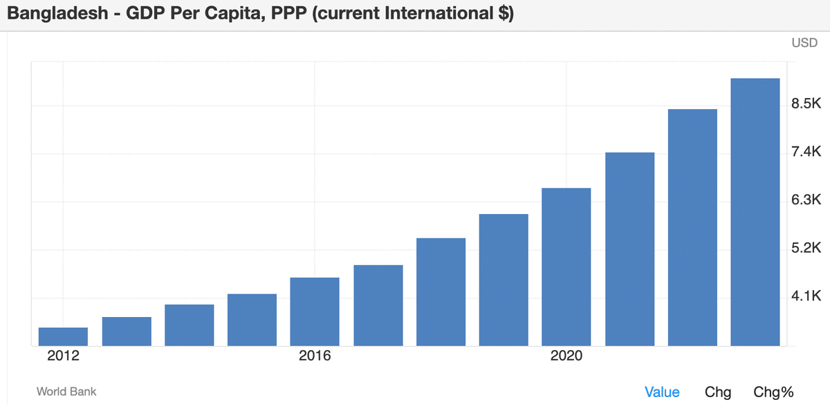 バングラデシュはそれに僅かに遅れる8,500ドルを超えた水準です。
