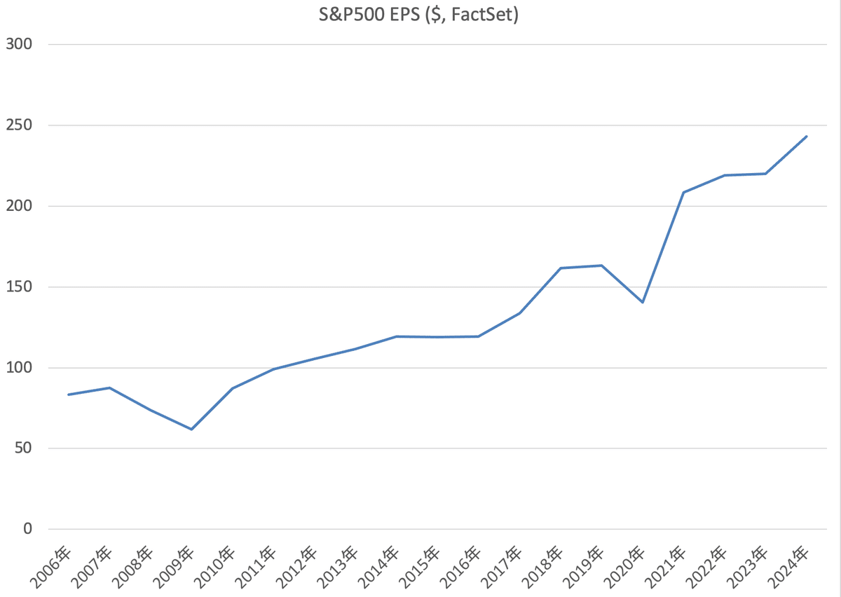 米国の代表的株価指数であるS&P500のEPSは2006年から2024年までの19年間に$83.20から$243.00に増えました。年平均成長率は5.80%でした。