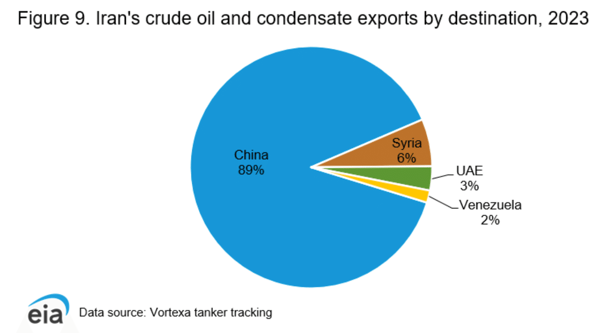 一方、中国はロシア(20%)、サウジアラビア(14%)、イラン(13%)、イラク(7%)から原油を買っています。つまりイランは3番目に重要な供給元なのです。