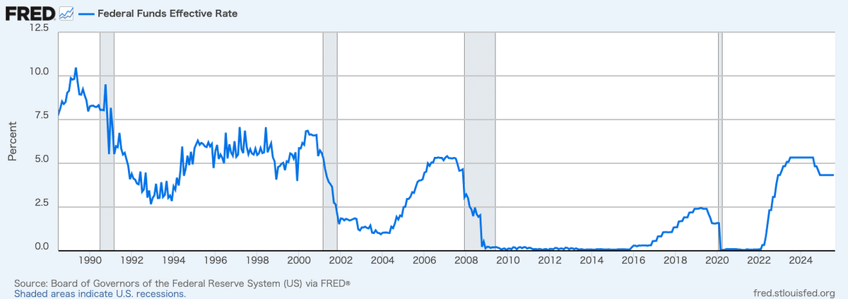 下はフェデラルファンズ・レートのチャートですが、インフレ退治のために利上げを繰り返したあと、利下げに転じ、一旦金利を水平飛行に戻した後、もう一度利下げを再開する瞬間(=いまが正しくそれです!)がリセッション(=シェードがかかった部分)リスクが最も高い瞬間だということがわかると思います。