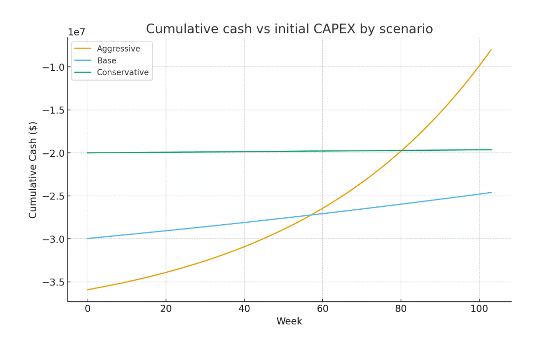 もしAIの課金が上手く行きGPU使用時間当たりの売上高が急成長すれば(上の図のAggressiveシナリオ)再投資の原資となるキャッシュもどんどん積み上がります。
