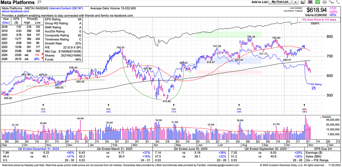 そこでマーケットサージで各銘柄のチャートを出してみると、マーケットサージのAIが勝手に直近の安値ならびにテクニカル的な考察(たとえば「カップ」=緑色の曲線)を描画します。下はメタ・プラットフォームズです。