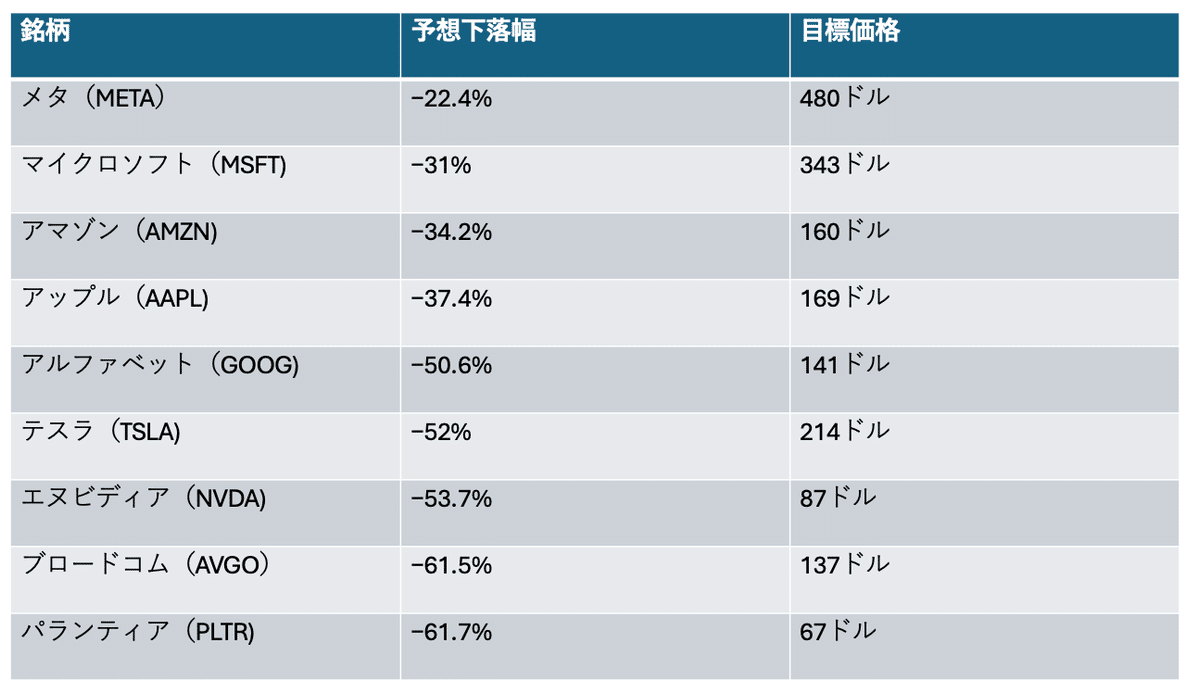 私は目先の相場は「下」を見ています。その場合、個々の銘柄にどのくらいダウンサイドを覚悟しなければいけないのでしょうか?