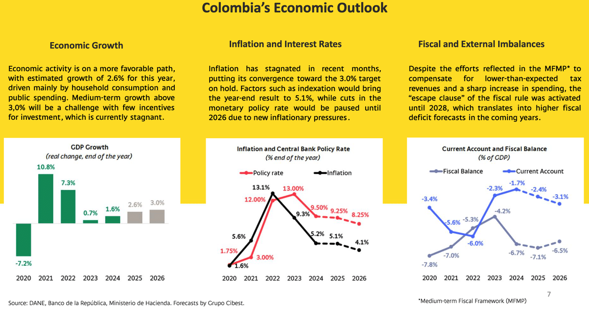 コロンビアは新型コロナ後の経済再開に伴うインフレの抑え込みに概ね成功し、政策金利は利下げ基調に入っており、それは今後のGDP成長率が加速することを示唆しています。なお住宅コストの上昇、最低賃金上昇圧力があることから中央銀行は2025年内はもう利下げしないと見られています。来年には約1%の利下げが見込まれています。