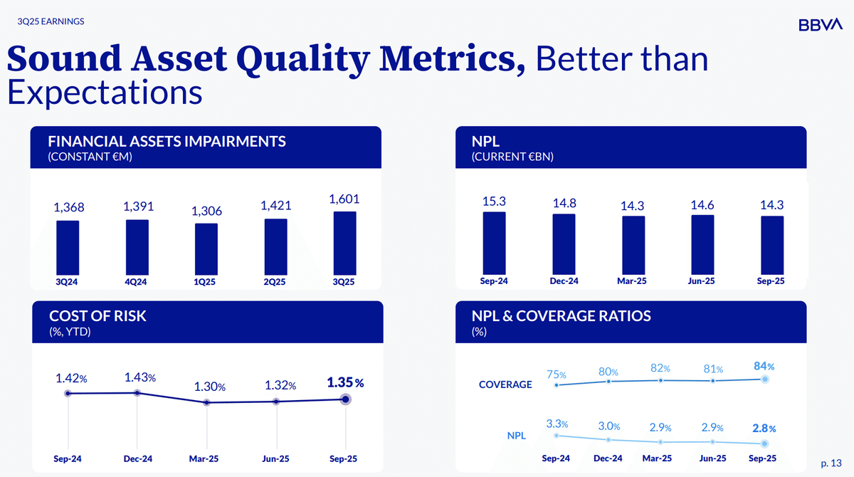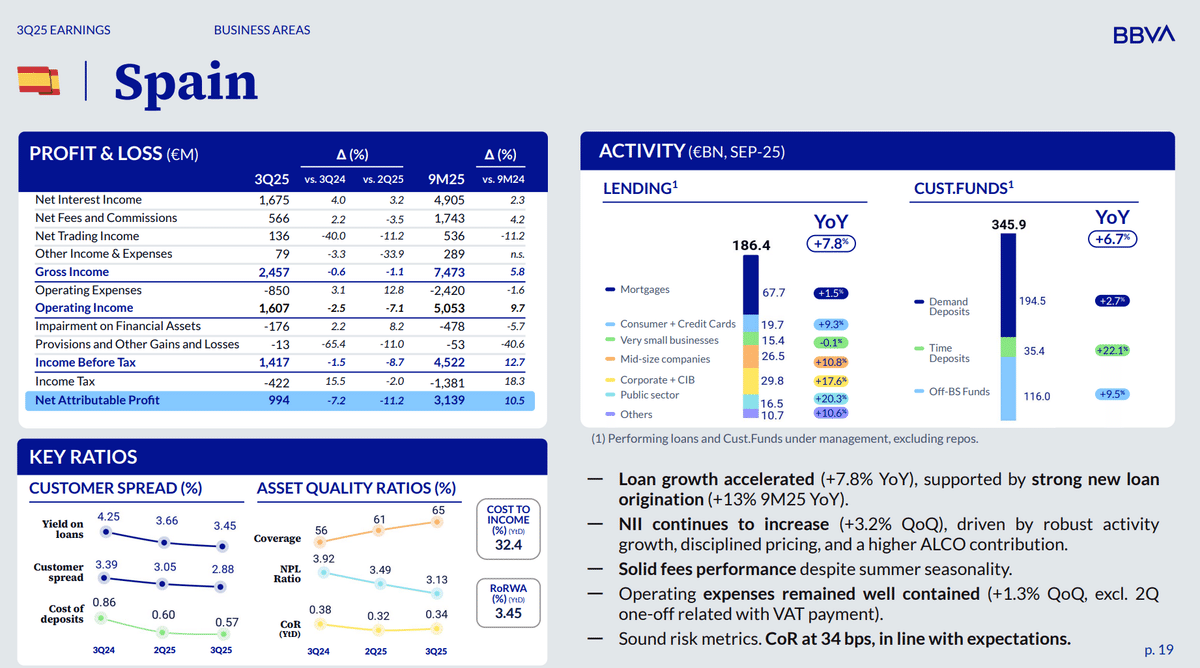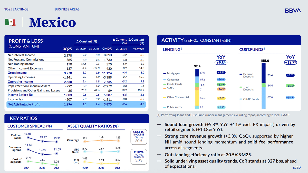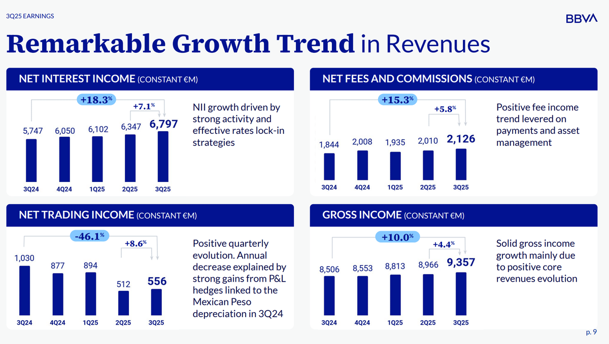 10月30日に発表されたBBVAの2025年第3四半期決算では純利益が25.31億ユーロでした。これは前年同期の26.27億ユーロより少ないですが、その理由はメキシコ・ペソの上昇で、ヘッジ売りしていた分が損になったことが関係しています。