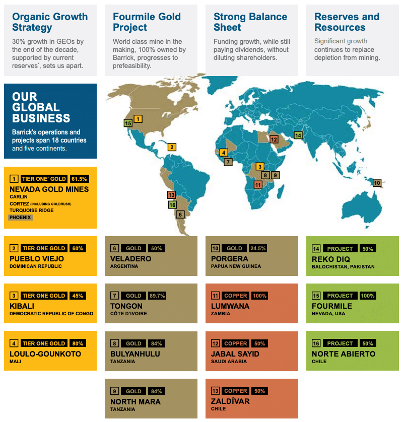 同社はネバダ州のカーリン、コルテス、ターコイスリッジに金山を所有(61.5%)しています。加えてカリブ海のドミニカ共和国にプエブロ・ヴィエホ金山(60%)を持っています。