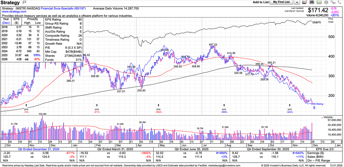 ストラテジー株は12月1日の立会で大きな出来高を伴い下髭を付けました。ここで一旦、ボトムを付けた可能性があります。