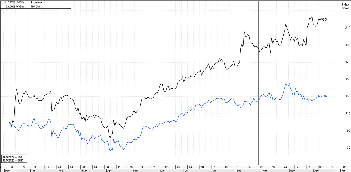 とりわけグーグル・クラウドが独自のAI向けシリコン、テンサー(TPU)でジェミナイのパフォーマンスを大幅に改善したというニュースが出て以来、ブロードコムのアウトパフォーマンスが目立っています。グーグルはテンサーの開発パートナーとしてブロードコムを使っています。