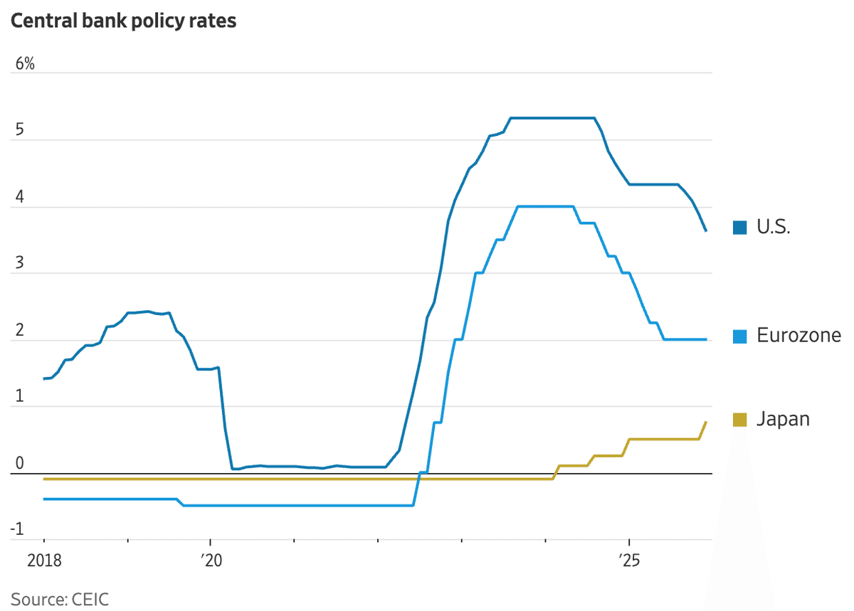 下は日、米、欧の政策金利のチャートですが、日本は上向き、米国は下向きになっていることがわかります。