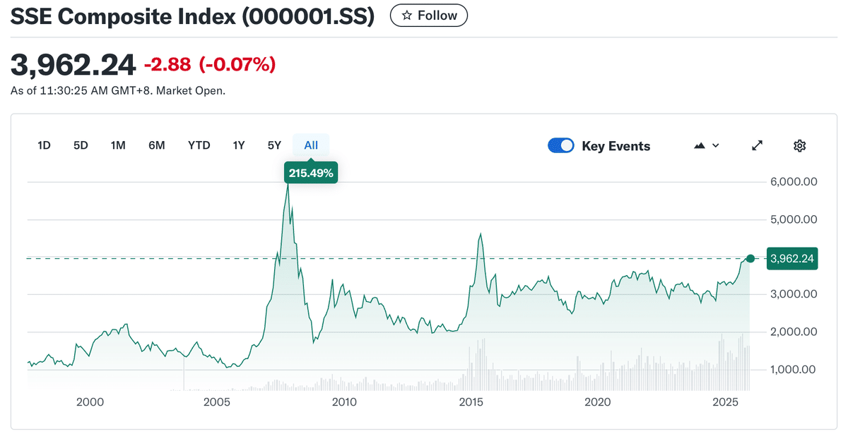 中国上海総合指数は北京オリンピック前につけた6124の高値を未だ奪還できていません。あれから18年が経過しています。