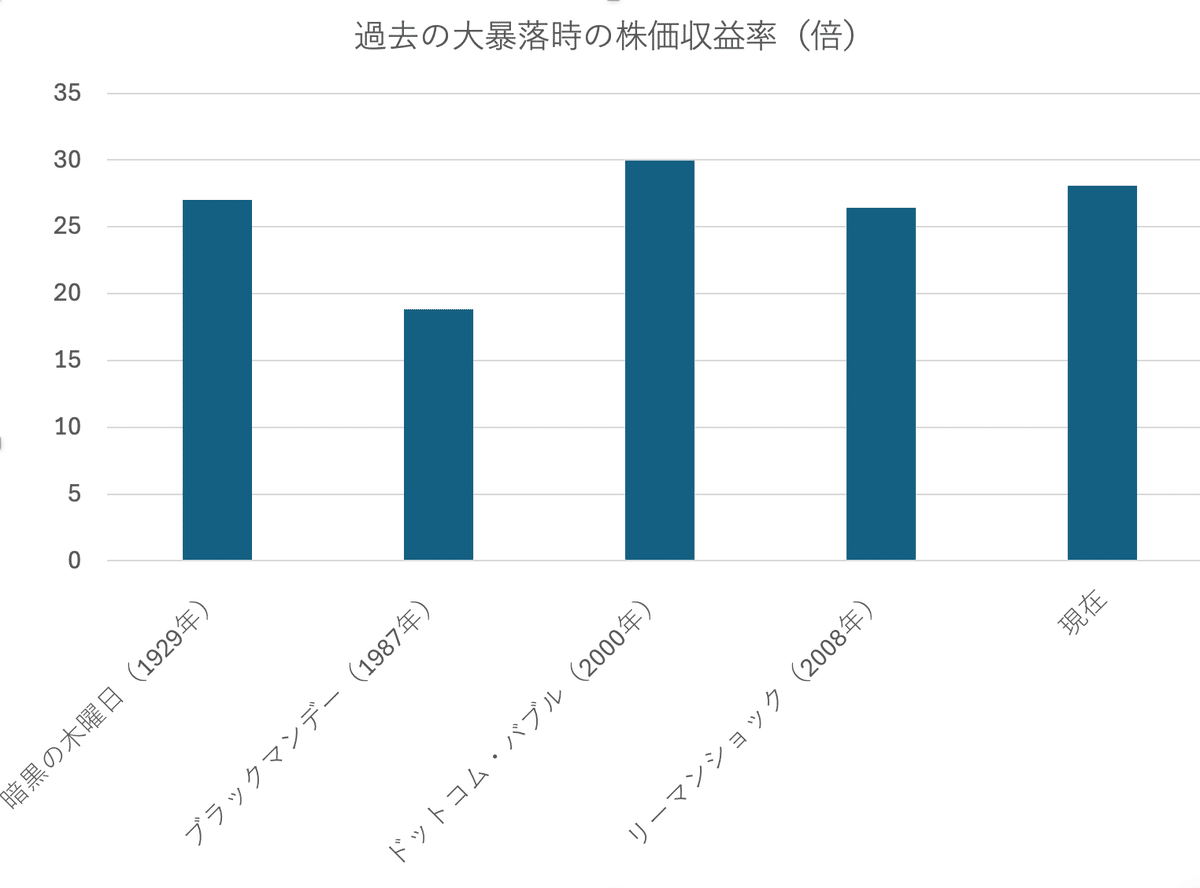 現在の米国株のバリュエーションは過去の大きな暴落の起点の水準とほぼ同じです。