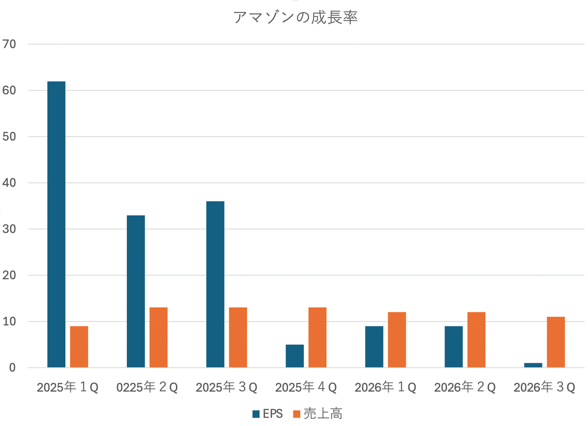 アマゾン(AMZN)は今期(2025年第4四半期)からEPS成長率がガクッと落ち、一桁台になると予想されています。言うまでもなくAWSにおける高水準のAI設備投資がその原因です。
