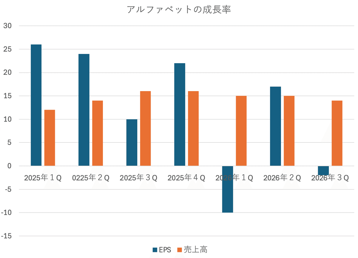 アルファベット(GOOG)の場合、今期は高いEPS成長率を維持できるもののそれ以降はEPS成長率が凸凹になると予想されています。