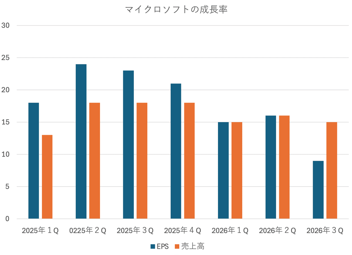 マイクロソフト(MSFT)は他社に先駆けてAI投資にブレーキを踏んだ関係で、EPSの落ち込み幅は小さいと予想されます。