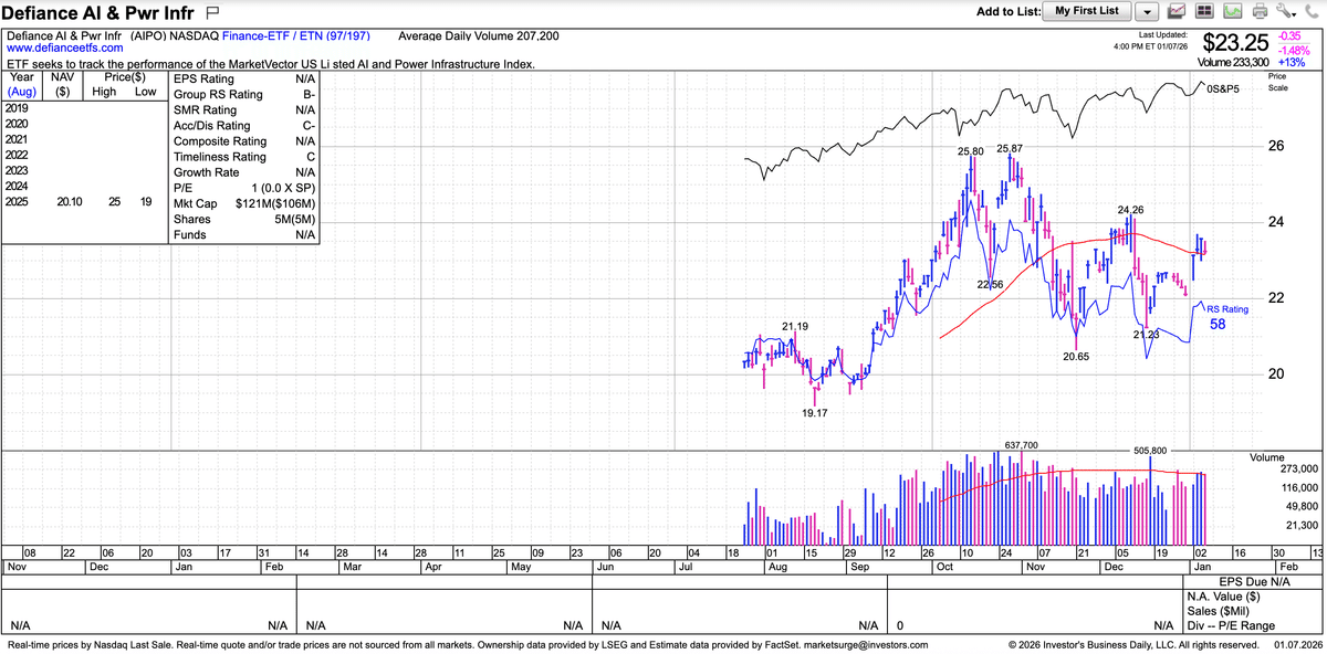 もうひとつ、AIが大量の電力を消費するので、電力インフラに関連するETFがあります。**デファイアンスAIパワー・インフラストラクチャETF(AIPO)**です。こちらも最近は冴えないパフォーマンスです。