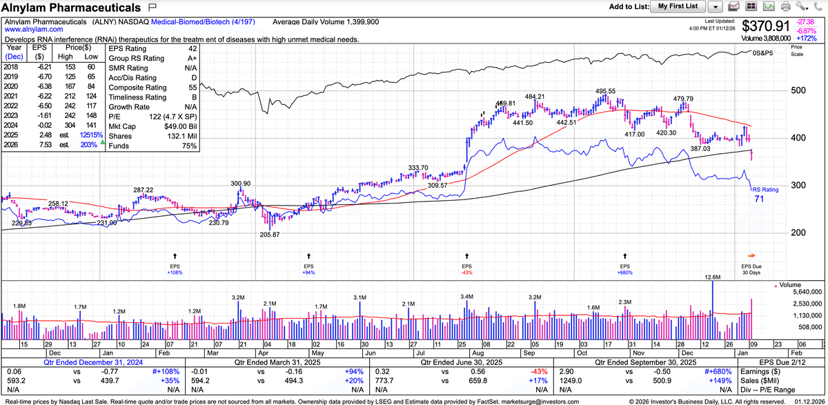 強いて言えばアルナイラム・ファーマシューティカルズ(ALNY)**が心アミロイドーシス(ATTR-CM)治療薬アムヴトラの2025年第4四半期の売上高がアナリスト・コンセンサス予想8.52億ドルに対し8.27億ドルになると発表した点です。アルナイラムは「市場が減速している」と説明しました。