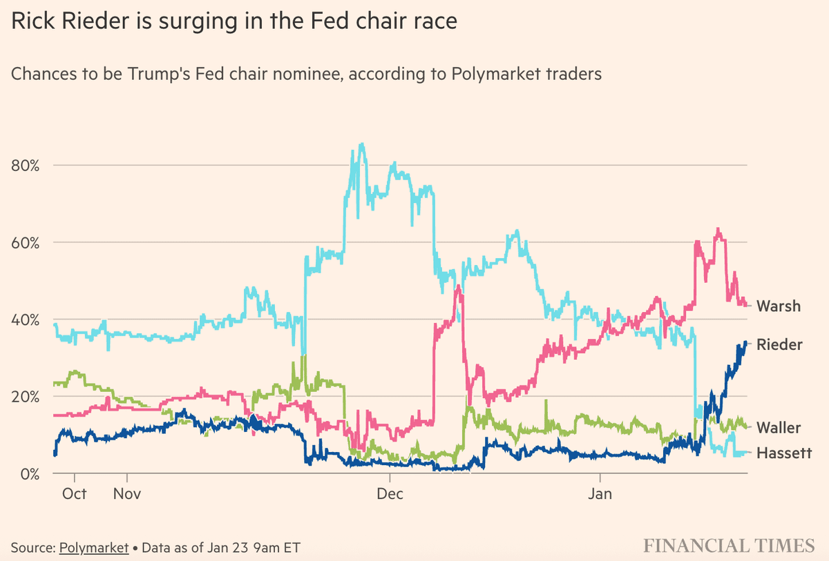 ベッティングサイト、ポリマーケットで次期FRB議長候補としてブラックロックのリック・リーダーに賭けるトレーダーが増えています。